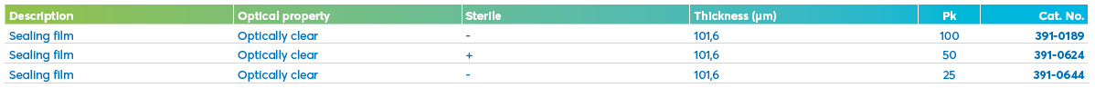 50 µm polyolefin films with 50 µm inert encapsulated silicone adhesive. Especially suited for qPCR, storage and protein crystallisation applications. The encapsulated silicone adhesive is non tacky until pressed against the sealing surface, at which time adhesive is released only in sealing areas to form the strongest available heat resistant seal around each well on the plate.