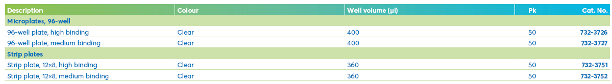 Highly pure polystyrene microplates designed and optimised specifically for affinity binding assays such as ELISA's. These plates are available with high binding and medium binding surfaces.