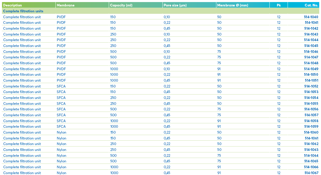Delivery: Full unit includes the filtration funnel with either 0,2 or 0,45 µm PES membrane, vacuum port, lid, collection reservoir and cap for storage.