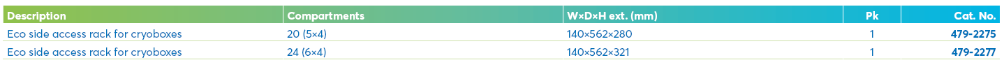 These racks are made from corrosion resistant stainless steel with smoothed edges. Eco Side access racks are a cost-effective freezer rack that will fit into any freezer.