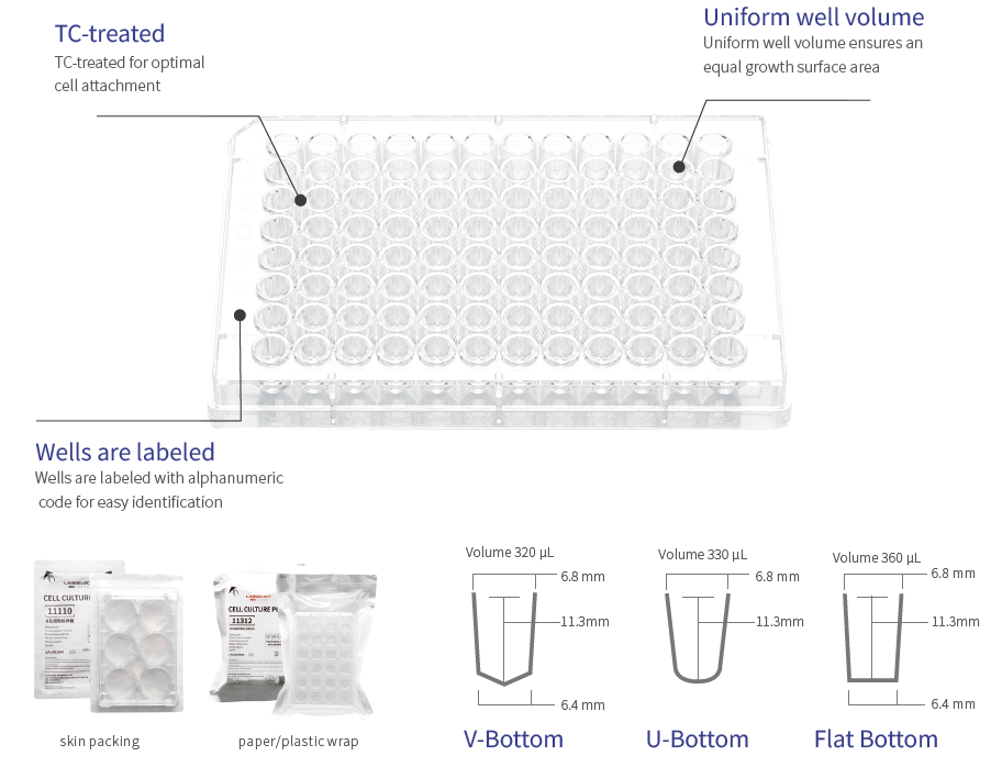 Labselect Cell Culture Plates are made of high-quality polystyrene materials, with strict process control, and ergonomic design. These plates are with flat bottom or U-bottom, lid with sealing ring, reducing evaporation and cross contamination. Individual alphanumeric codes for well identification. Safe and easy handling through pronounced corrugation of the plate and smaller lid. TC-treated and non-treated cell culture plates are available.