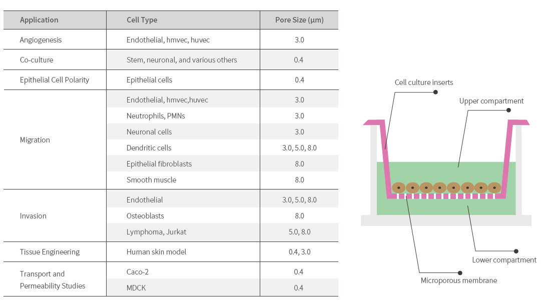 • Cell culture treated PC or PET membranes for optimal cell attachment
