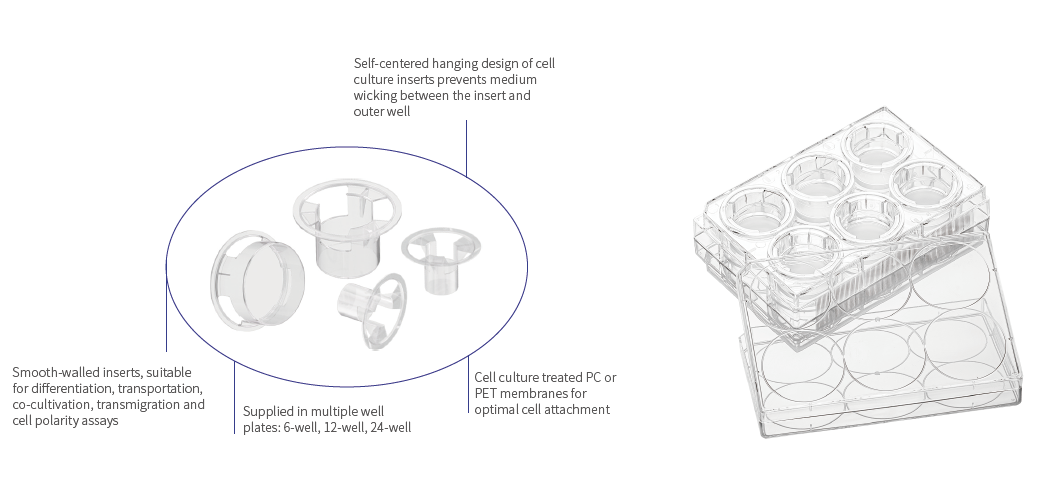 Labselect Cell Culture Inserts are convenient, ready-to-use permeable support devices pre-packaged in standard multiple well plates. Allowing the access of media from both their apical and basolateral sides. The unique, self-centered hanging design prevents medium wicking between the insert and outer well. Cell growth, structure, and function more closely mimic what occurs in vivo. TC-Treated for optimal cell attachment. Smooth-walled inserts, suitable for differentiation, transportation, co-cultivation, transmigration and cell polarity assays. Cell culture inserts are available in a wide variety of sizes and two membrane types.
