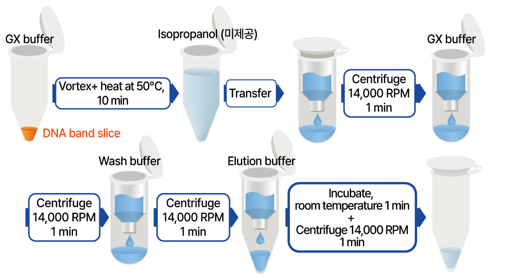 Gel Electrophoresis 후 Agarose gel에서 원하는 순수 DNA만 정제하도록 최적화 되었습니다. 빠르고 간편하게 정제되며 DNA는 ligation, sequencing 등 후속 실험에 사용할 수 있습니다.