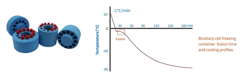 Biosharp Cell Freezing Container in combination with a -80°C freezer, will provide alcohol-free freezing at the rate of -1°C/minute that is ideal for cryopreservation of most cells and cell lines. Using a combination of uniform-density cross-linked polyethylene foam, a solid state core, freezing profiles are consistent and reproducible. The foam is non-absorbent and will impose negligible change in the freezer environment; thereby protecting nearby frozen samples. The small footprint and low profile make this anideal cooling solution for cell preparat performed.
