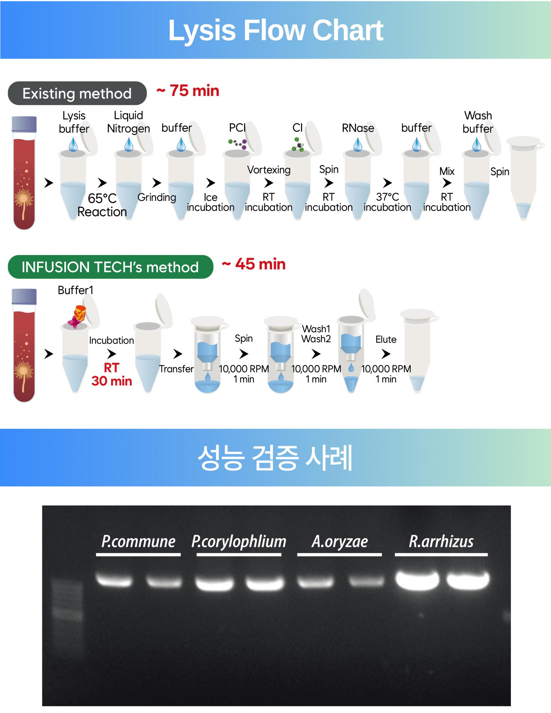 특수 제작 폴리머를 사용하여 까다로운 곰팡이 세포벽 대상으로 추출 효율이 뛰어납니다. 추출된 DNA는 후속 실험으로 PCR, qPCR, 시퀀싱에 사용할 수 있습니다.