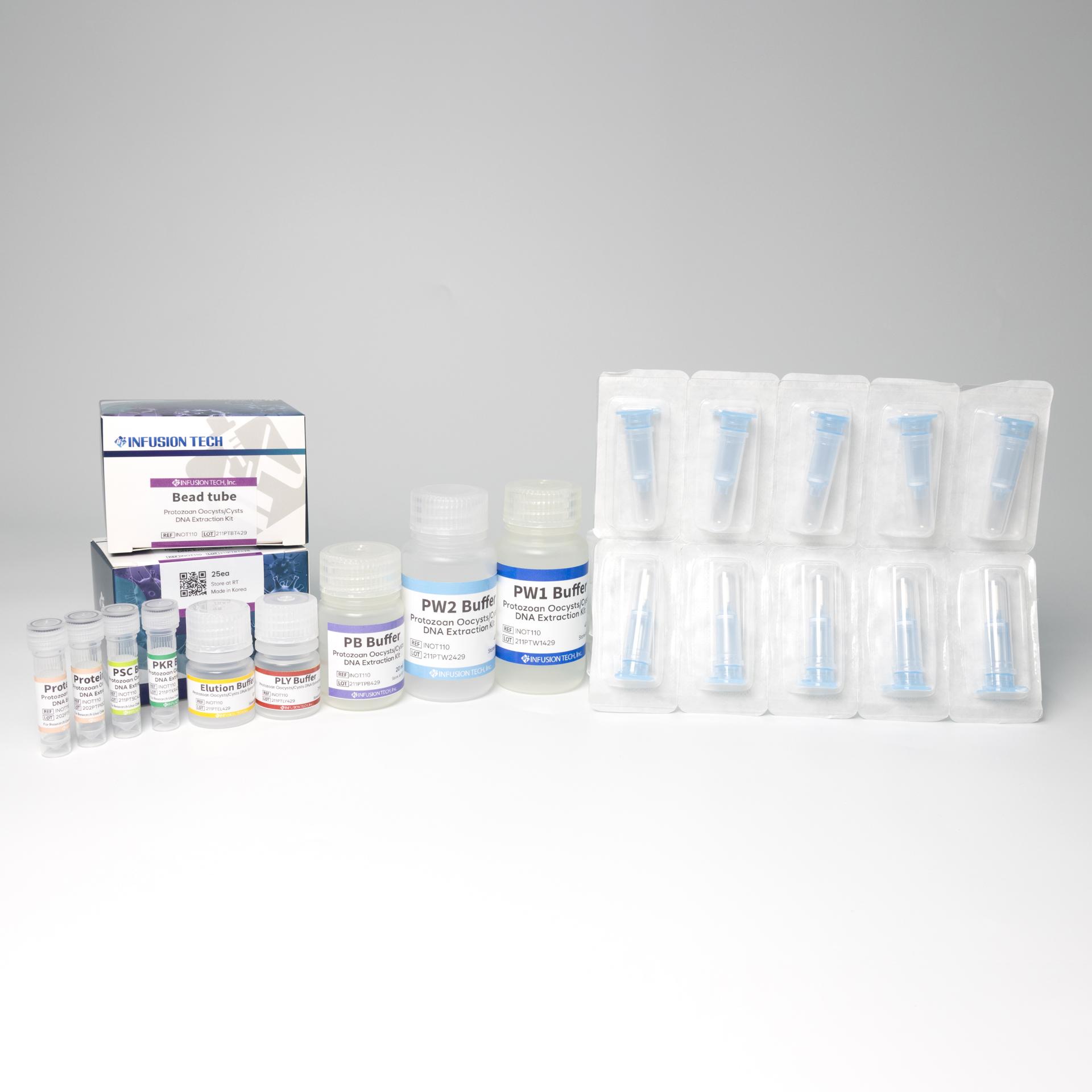 Protozoan Oocysts/Cysts DNA Extraction Kit (INOT110)는 분변, 분변 현탁액, 파쇄한 조직, 조직 현탁액에 있는 원충의 충란 또는 낭포에서 DNA를 추출하는 제품입니다.