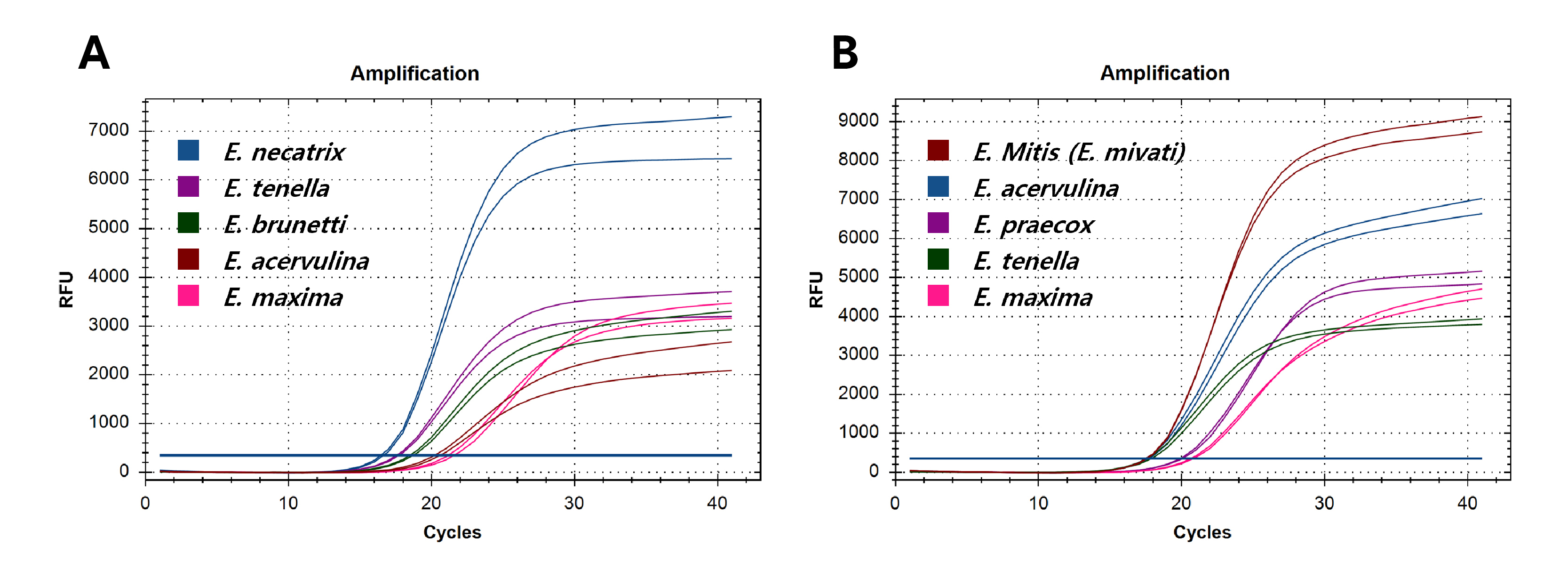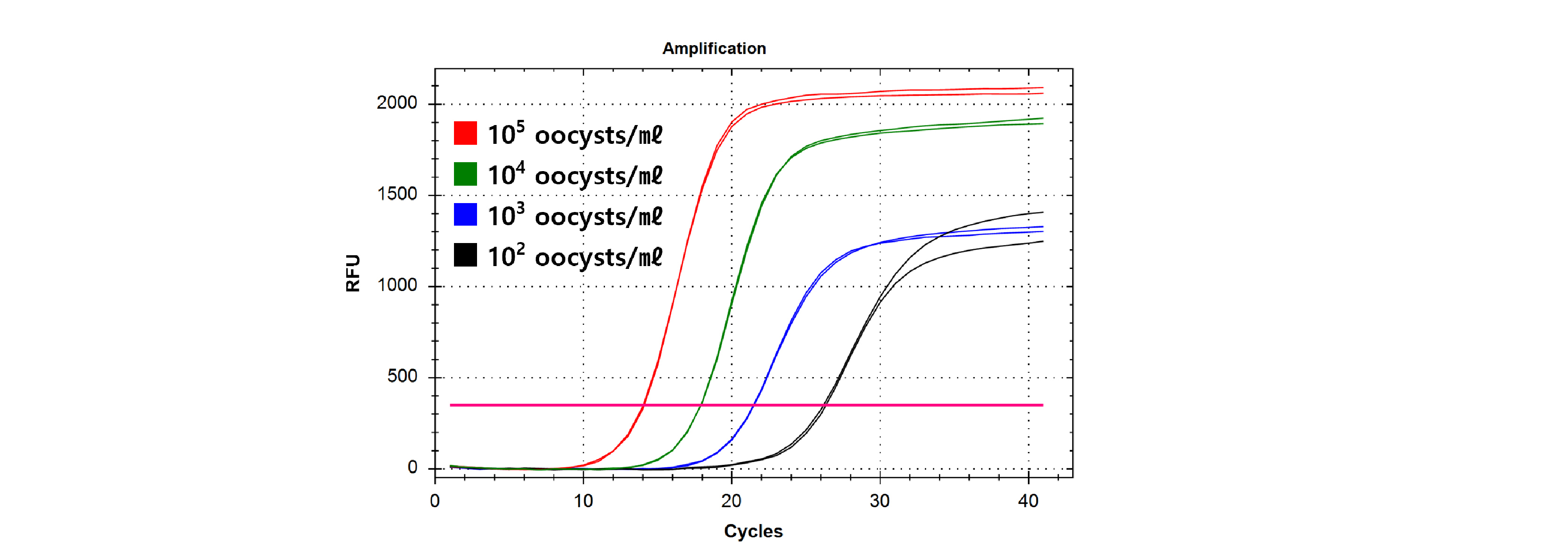 The collected oocysts of Eimeria spp. were used to spike other oocyst-free chicken feces to give final concentrations of 105, 104, 103, 102 oocytes/㎕. Oocyst DNA in fecal samples were extracted using Protozoan Oocysts/Cysts DNA Extraction Kit (INOT110) and analyzed by quantitative PCR (Opti™ Ei-qPCR, AVPS-010)