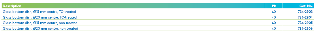 Confocal dishes are suitable for fluorescent, confocal and phase-contrast microscopy experiments. These dishes combine the convenience of standard 35 mm, PS cell culture dishes with the optical benefits of glass. Dishes are available with Ø 20 mm glass centre, with or without a tissue culture-treated surface.