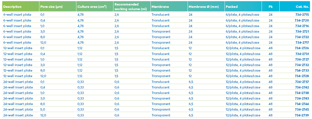 PC, sterile, with lid. These insert plates feature a thin, semi-transparent polycarbonate membrane with pore sizes from 0,1 to 12,0 μm.